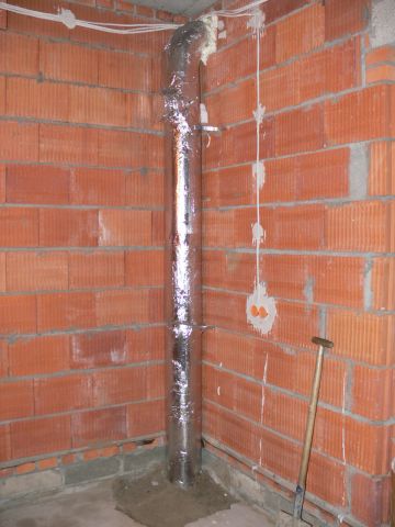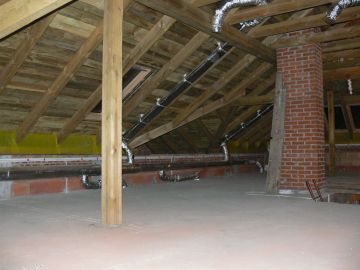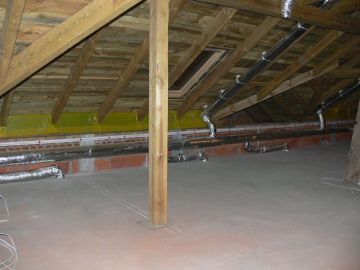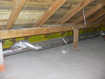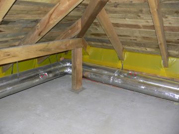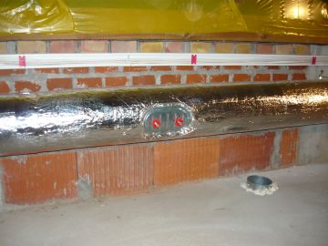 Montaż instalacji wentylacyjnej opartej na systemie rur sztywnych spiro w całości izolowanych. Wzduż połaci dachowych zastosowano system kanałów prostokątnych izolowanych w celu uniknięcia powstawania liniowych mostków cieplnych. Dodatkowo wykonano podejscie do wymiennika ciepła Awadukt Thermo. Instalacja została zabezpieczona przed zabrudzeniem podczas dalszych prac.