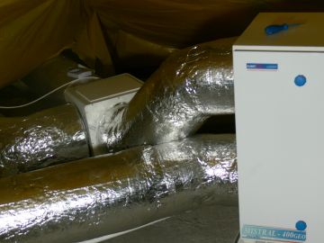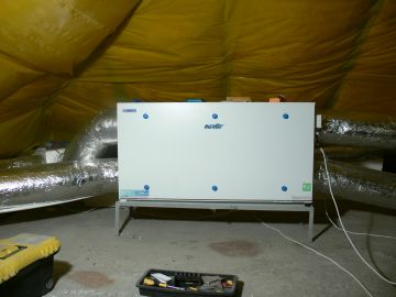 Montaż centrali wentylacyjnej Mistral GEO. Układ wyposażonyw w wymiennik gruntowy i przepustnicę automatyczną GWC. Cała instalacja po zakończeniu prac została wyregulowana w celu uzyskania założonych parametrów.