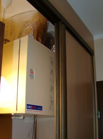 Montaż rekuperatora Renovent z wymiennikiem przeciwpądowym wraz z regulacją wydajności systemu. Centrala wentylacyjna została schowana w szafie.