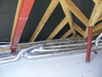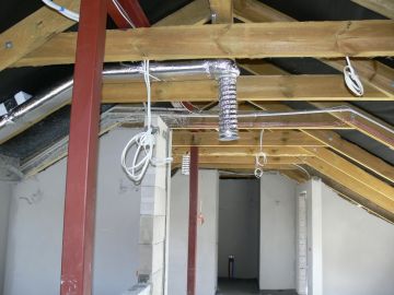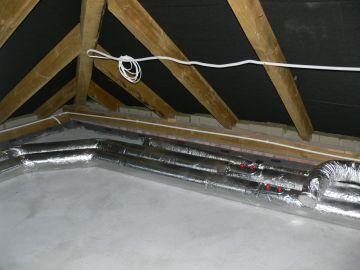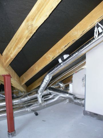 Montaż instalacji wentylacyjnej wykonanej w technologii rur spiro w całości izolowanych. Na podejściach wzdłuż połaci dachowych zastosowano system kanałów prostokątnych w celu uniknięcia powstawania liniowych mostków cieplnych. Dodatkowo wykonano podejście do wymiennika gruntowego.